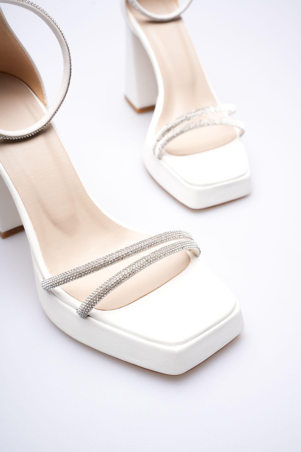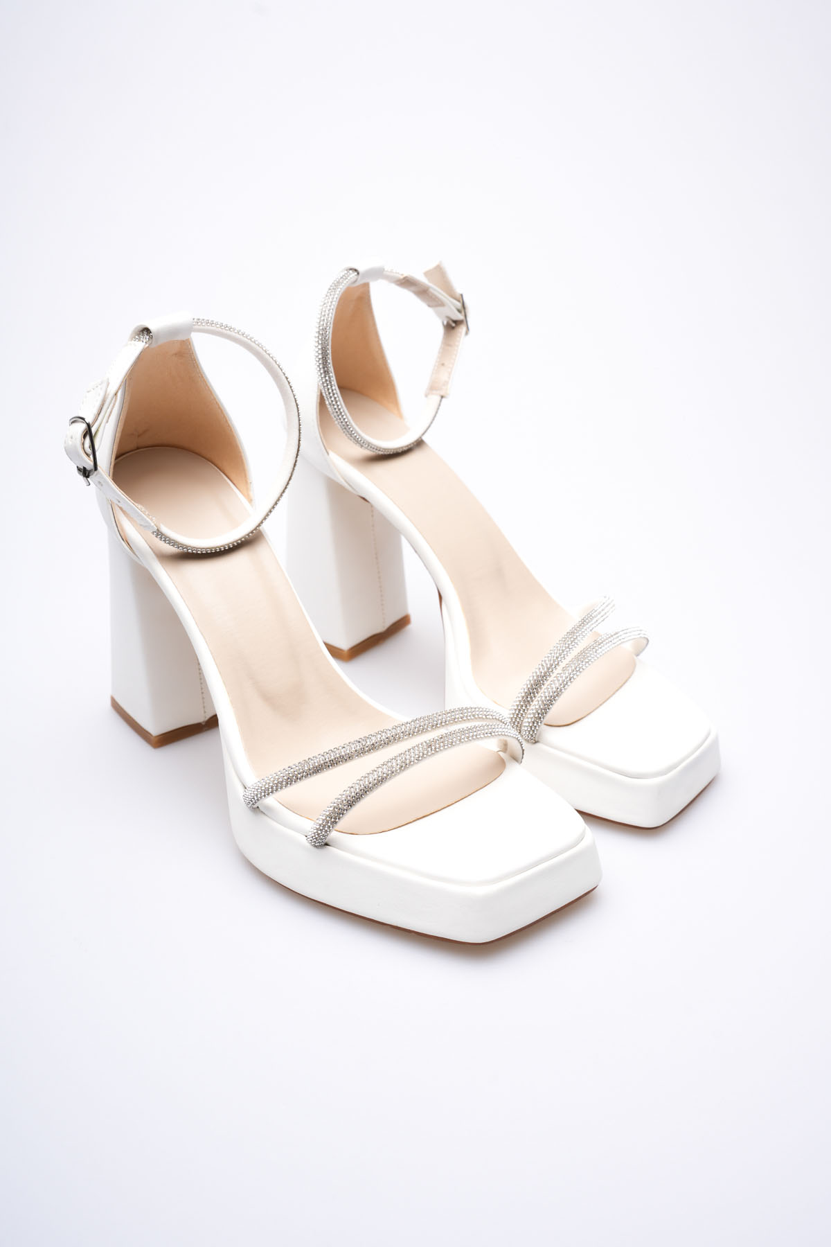 Kadın Beyaz Taş Detaylı Kalın Topuklu Şık Sandalet TR20MY26B