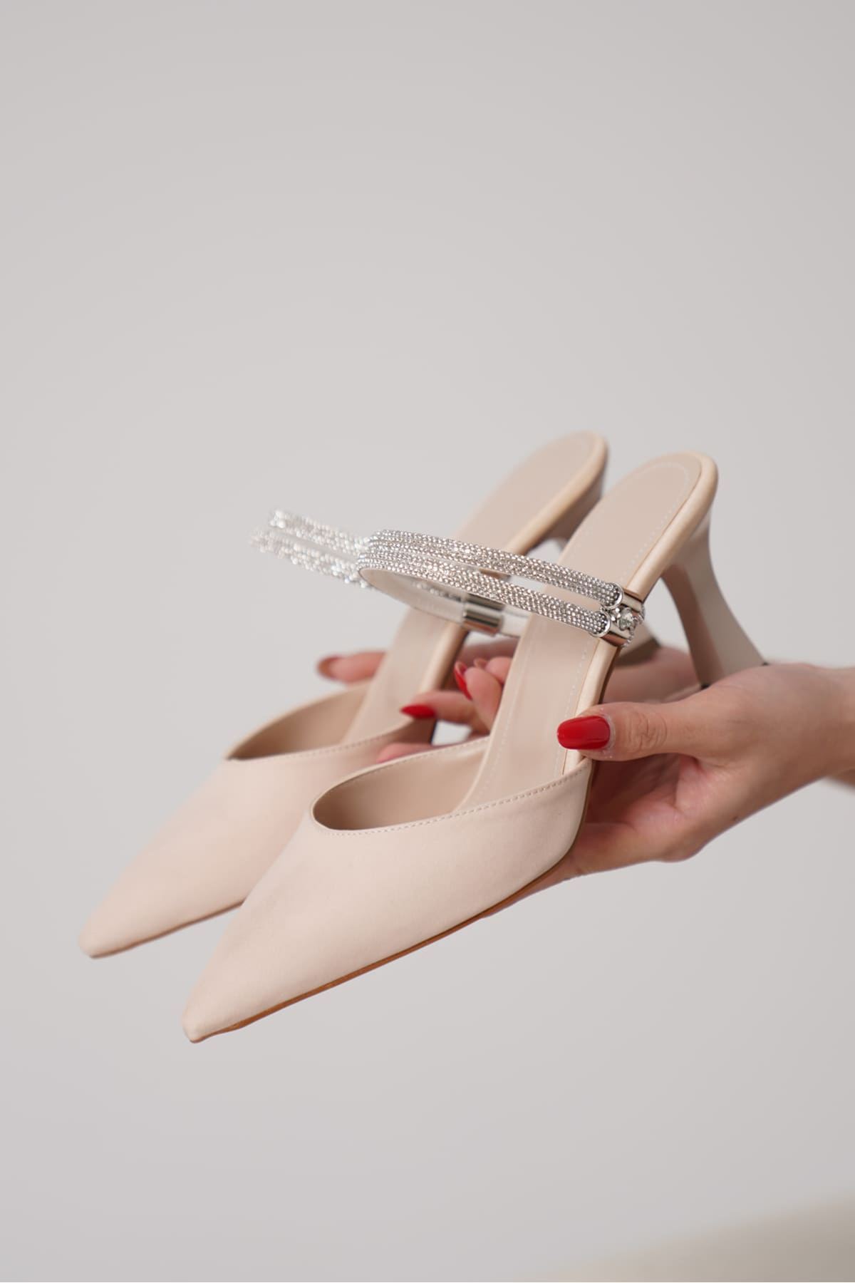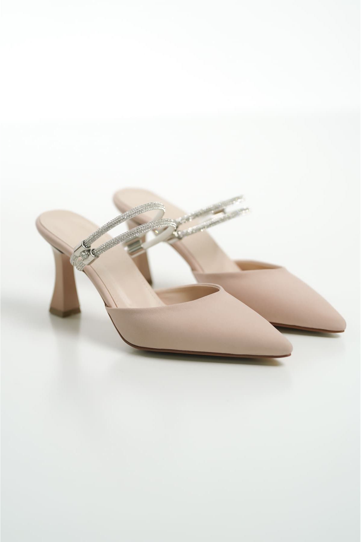 Kadın Taşlı Bej Saten Topuklu Ayakkabı TR12MS04B